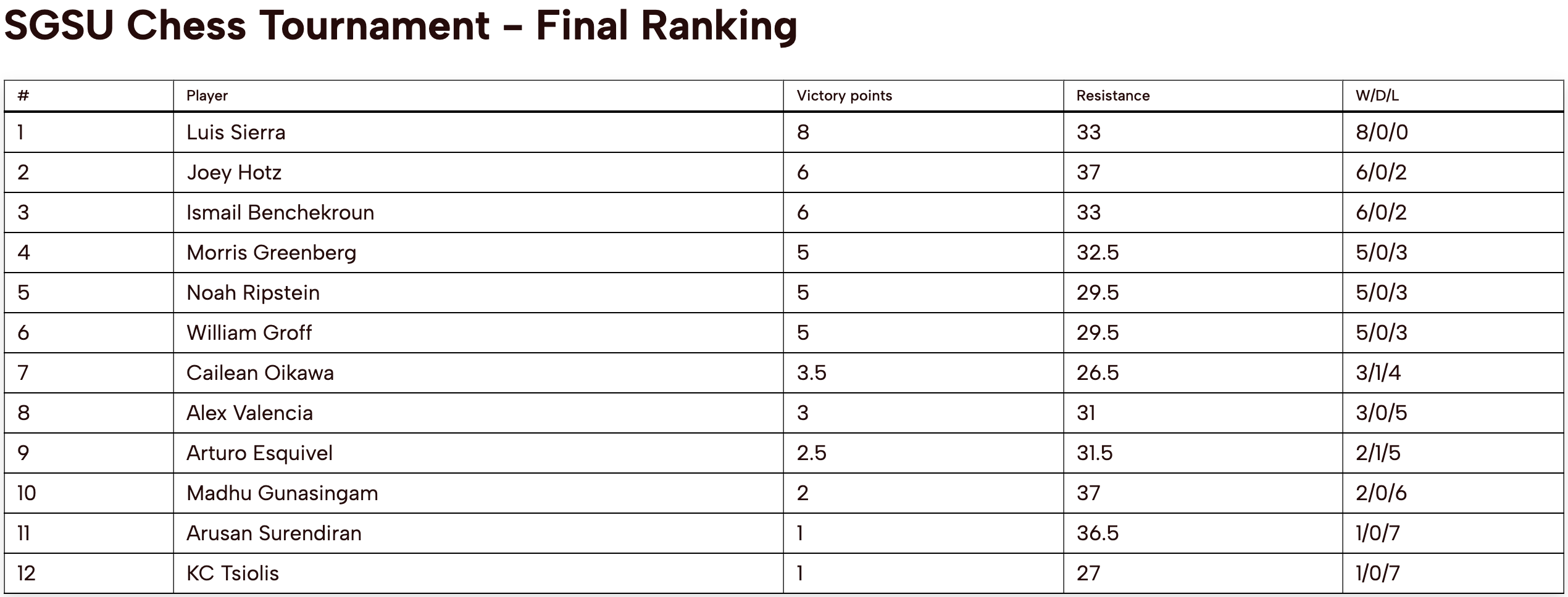 SGSU Chess Tournament Standings
